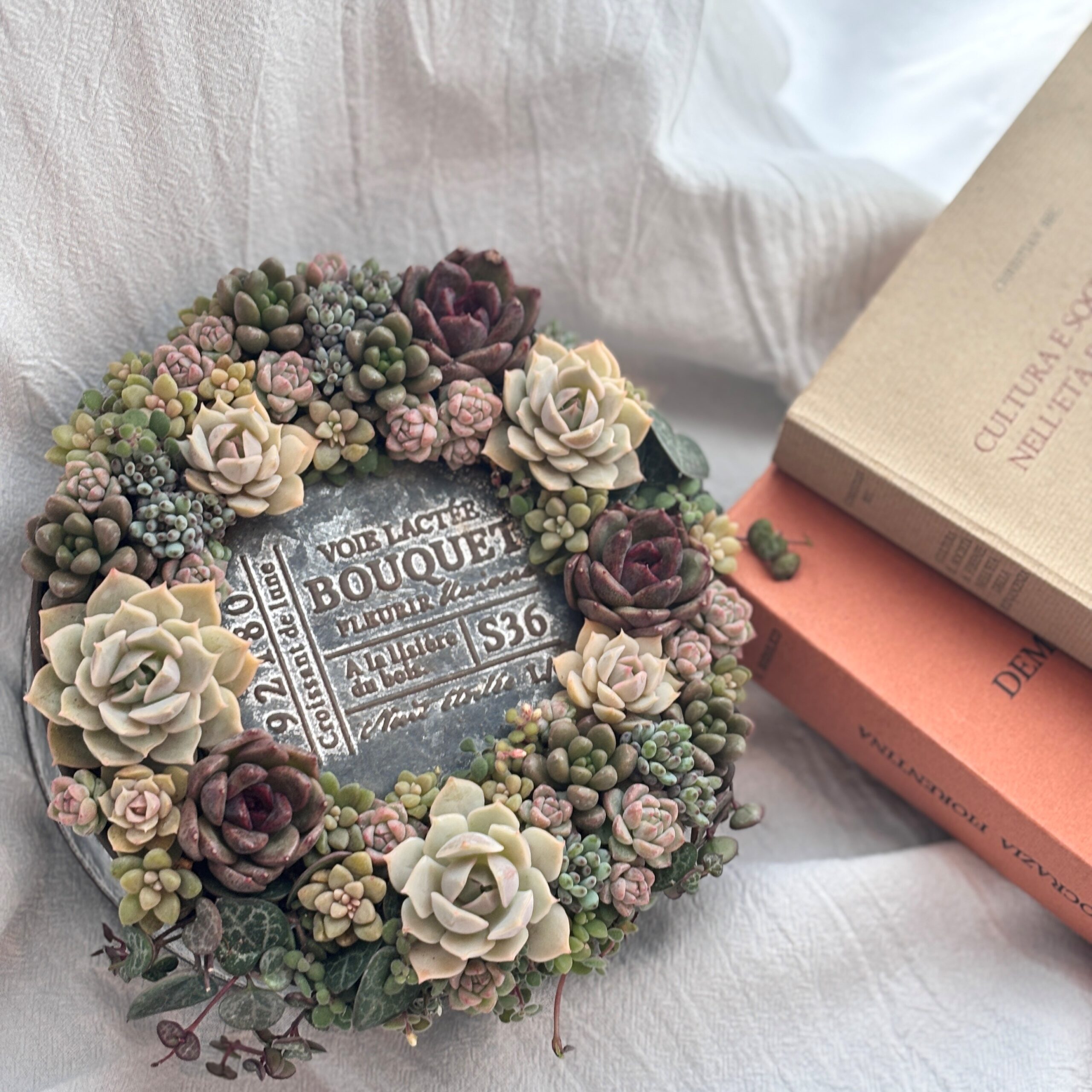 【自己紹介文】 姫路で多肉植物のオリジナル実生苗の育苗を中心に様々な多肉植物を10年以上育てています。実生は2021年から開始し2024年から販売委託店様にPome K札で苗を納品しております。この度は多肉イベント初出店となります。ブリキリース鉢、アンティークブリキポット、レターケース鉢、天然素材で編んだカゴ、テーブルリースやクラフトワークにぴったりのお皿など、ナチュラルなティストの素材の雑貨を色々準備しております。数量限定で可愛い多肉寄せ植えセットもご用意しております。