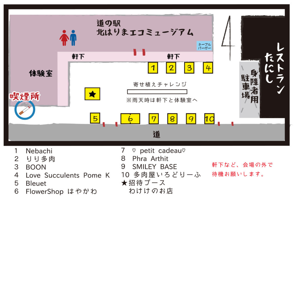 ・出店できる内容…メインは、多肉植物・サボテンですけども、生の切り花以外の植物なら、以下の植物の販売もOK。珍奇植物 山野草 観葉植物 盆栽 苔 花苗 エアープランツ。例えば「観葉植物だけ取り扱う」でも大丈夫。