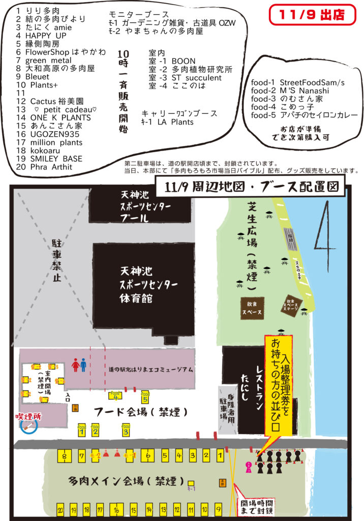 ※9:40には多肉会場入り口、集合 ※配布開始時間まではスタッフいません。時間までは並んでお待ちください。 | ※9:40には多肉会場入り口、集合 | ※駐車可能は 道の駅開店時間頃から | ※駐車可能は 8:00~15:00 |