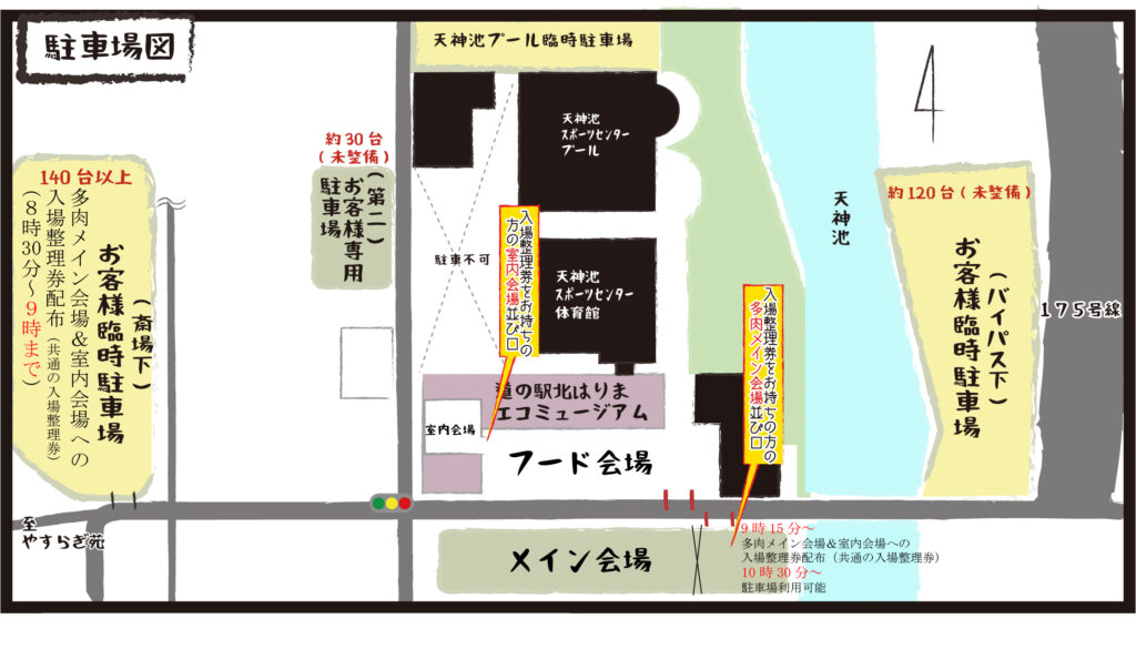 駐車場の混雑が予想されます。上記の駐車場所や駐車可能時間をご確認のうえご来場ください。尚、当日は警備員の誘導に従ってください。