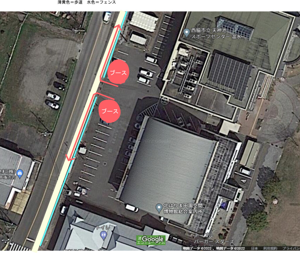 フェンスの外に歩道があるので、その歩道に列を流すようにしてください。