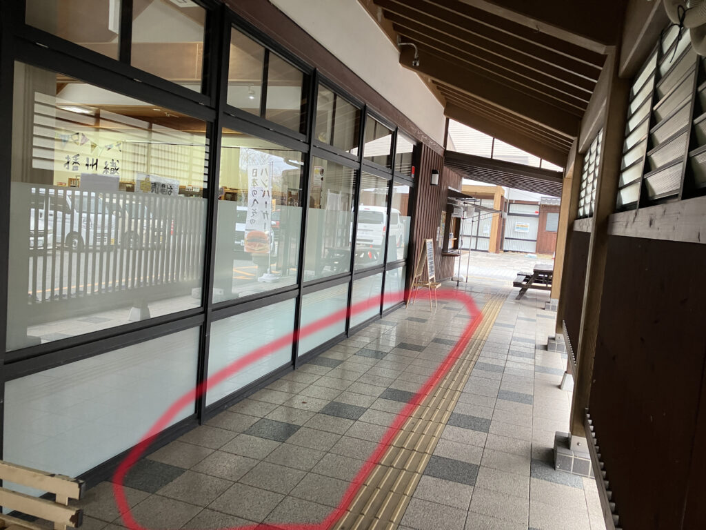 ⑤点字ブロックの上は何も置けない。画像1枚目の赤の部分が使える。