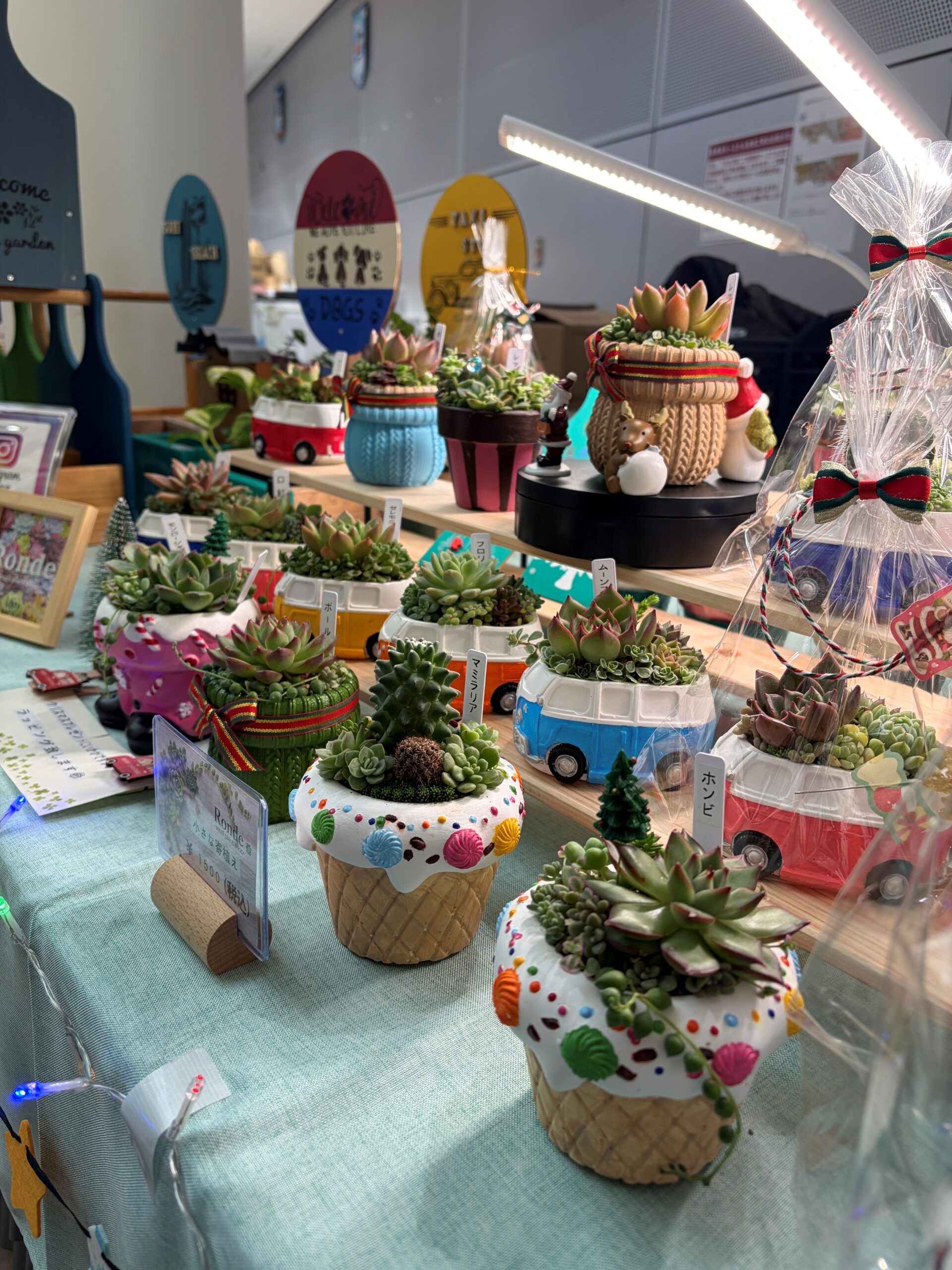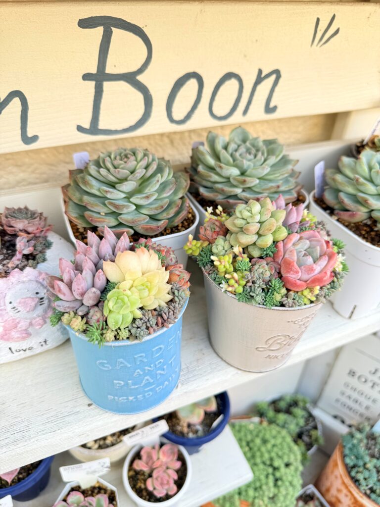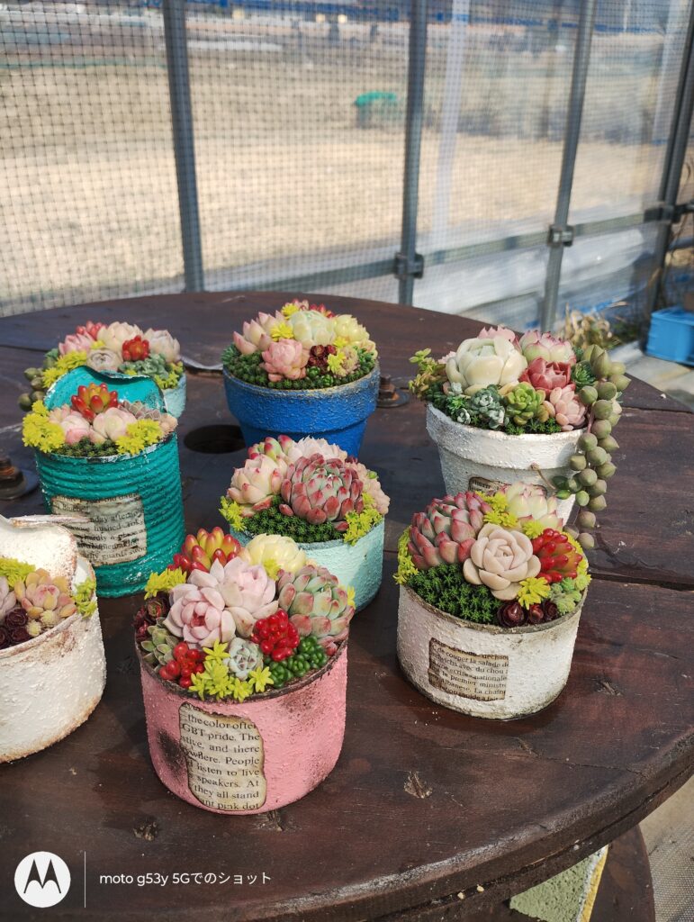 【出店内容】 多肉苗、寄せ植え、モルタル鉢、リメ缶、撮影スポットなど