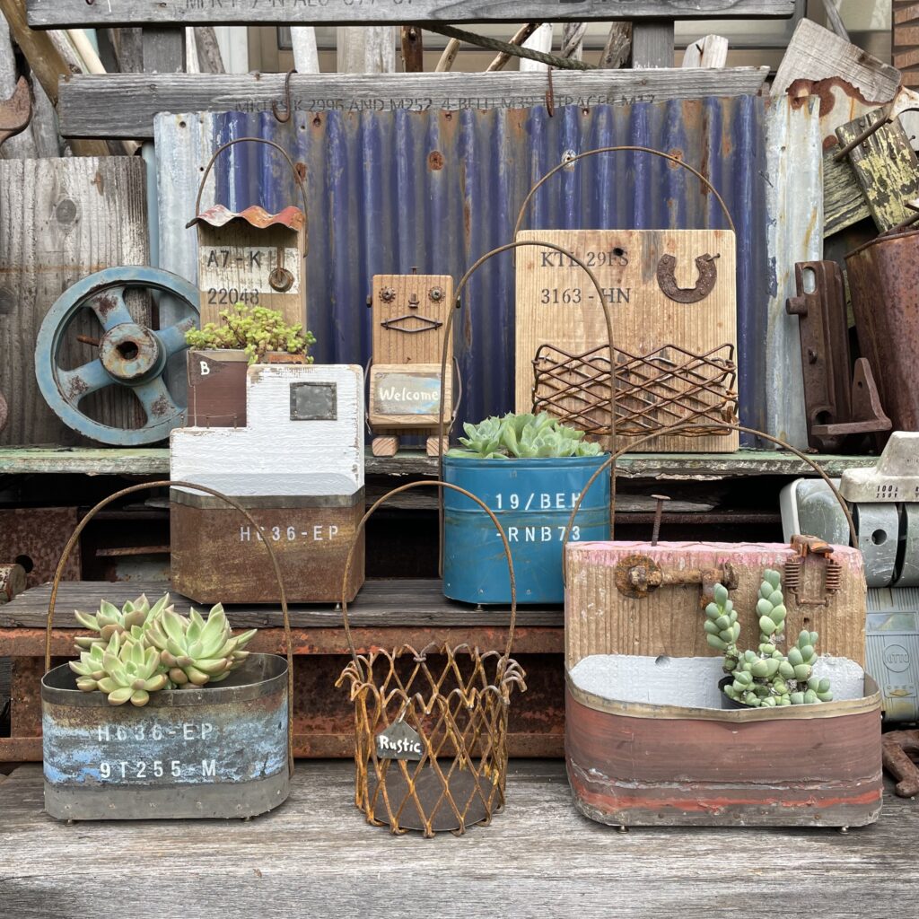 【出店内容】 古材や錆の手作りプランターなど